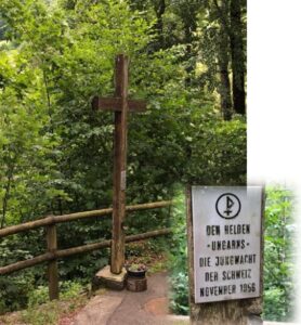 1956. nov. 18-án állították ezt az emlékkeresztet svájci fiatalok (Jungwacht, hasonló a cserkészethez) a magyar szabadságharc emlékére. Előző napon Luzernből indult el a kereszttel a több mint 400 résztvevős zarándoklat a hideg novemberi éjszakán a kereszt helyére, Flüeli-Ranftba. Éjszakai szentmisével kezdődött a zarándoklat és hajnali istentisztelettel zárult a kereszt megszentelésével. A kereszten lévő felirat fordítása: „A magyar hősöknek – A svájci Jungwacht – 1956. november”.