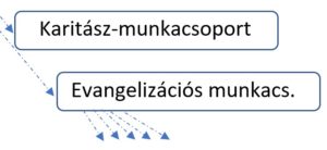 Ezért fontos a karitatív munkacsoport mellett a hit továbbadásának munkacsoportja, nevezzük evangelizációs munkacsoportnak. Ha visszagondolunk a leendő testületünk legfontosabb munkacsoportjaira (ld. fentebb a testület lehetséges felépítésének organigrammája), és ott két munkacsoport szerepel kiemelten. Ez a karitász és a másik az evangelizációs. Legalább ez a kettő nagyon fontos lenne. Mindenki, aki nem a karitász munkacsoportot választja, az az evangelizációs munkacsoportba tartozhat. De ez további munkacsoportokká fejlődhet (ld. fentebb az organigrammot), ami a kedves hívek jelentkezéseitől, aktivitásától függ.
